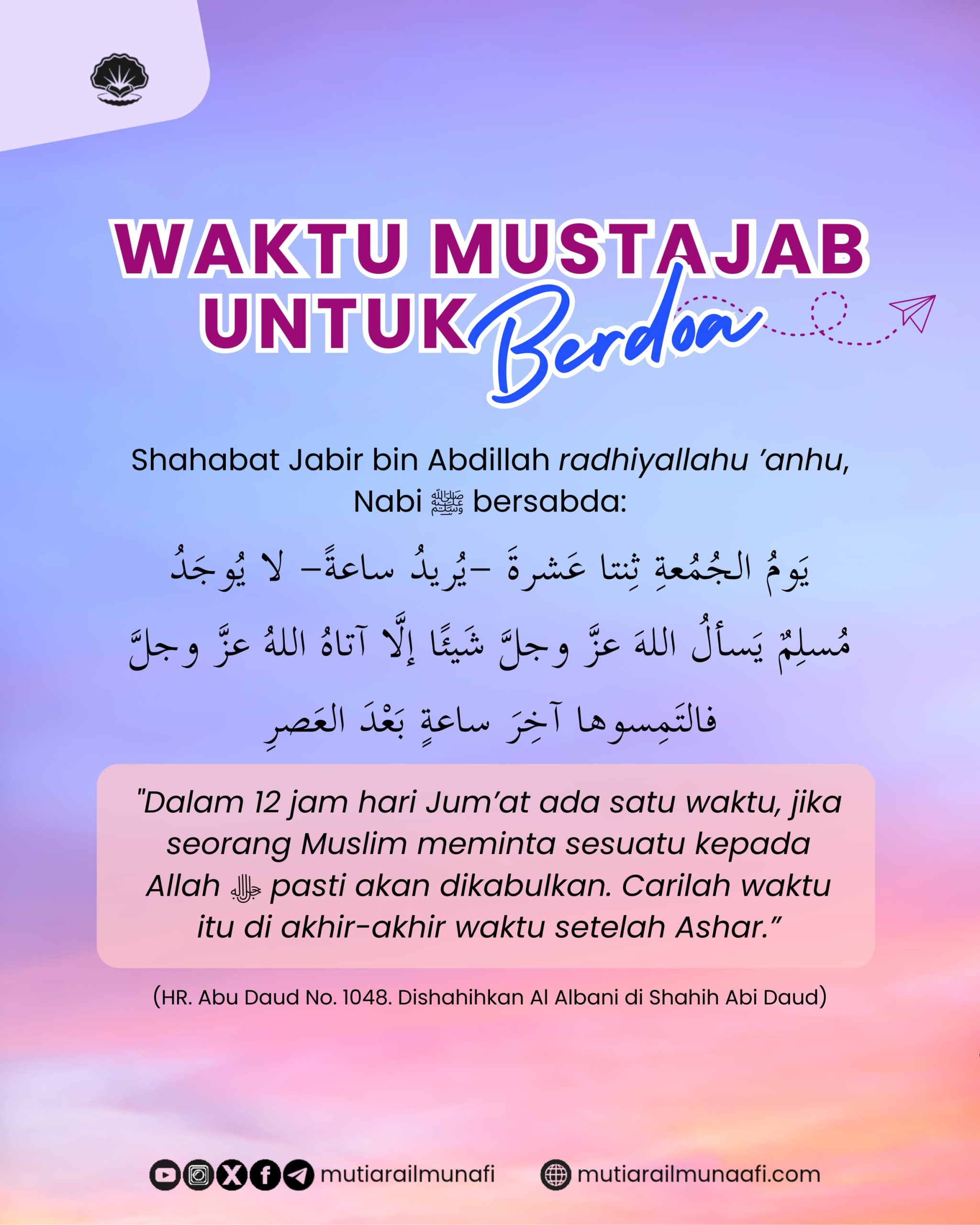 📚 𝘍𝘈𝘞𝘈𝘐𝘋 𝘚𝘌𝘙𝘐𝘌𝘚 🌱 𝗕𝗘𝗥𝗦𝗘𝗠𝗔𝗡𝗚𝗔𝗧 𝗗𝗢’𝗔 𝗗𝗜 𝗪𝗔𝗞𝗧𝗨 𝗦𝗘𝗧𝗘𝗟𝗔𝗛 𝗔𝗦𝗛𝗔𝗥 𝗗𝗜 𝗛𝗔𝗥𝗜 𝗝𝗨𝗠’𝗔𝗧 Di hari Jum’at ada waktu mustajab untuk…