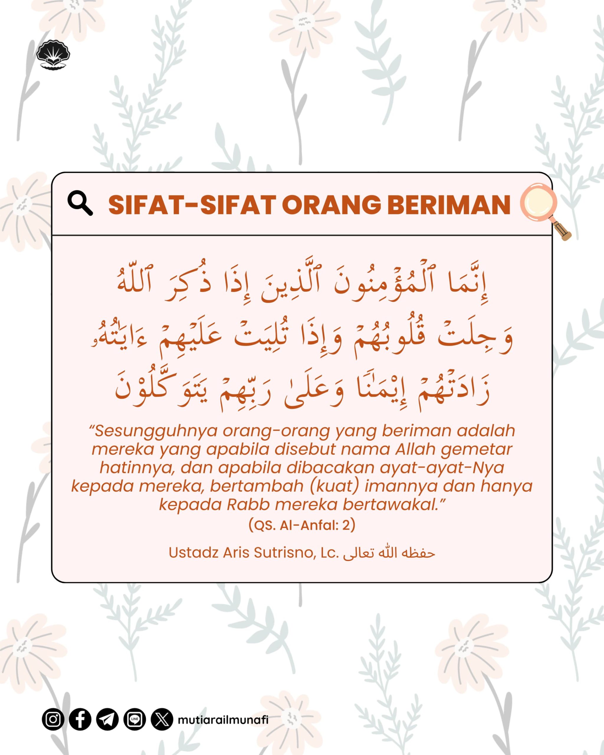 🌱 𝗦𝗜𝗙𝗔𝗧-𝗦𝗜𝗙𝗔𝗧 𝗢𝗥𝗔𝗡𝗚 𝗕𝗘𝗥𝗜𝗠𝗔𝗡 Allah تعالى berfirman: إِنَّمَا ٱلۡمُؤۡمِنُونَ ٱلَّذِینَ إِذَا ذُكِرَ ٱللهُ وَجِلَتۡ قُلُوبُهُمۡ وَإِذَا تُلِیَتۡ عَلَیۡهِمۡ ءَایَـٰتُهُۥ زَادَتۡهُمۡ…
