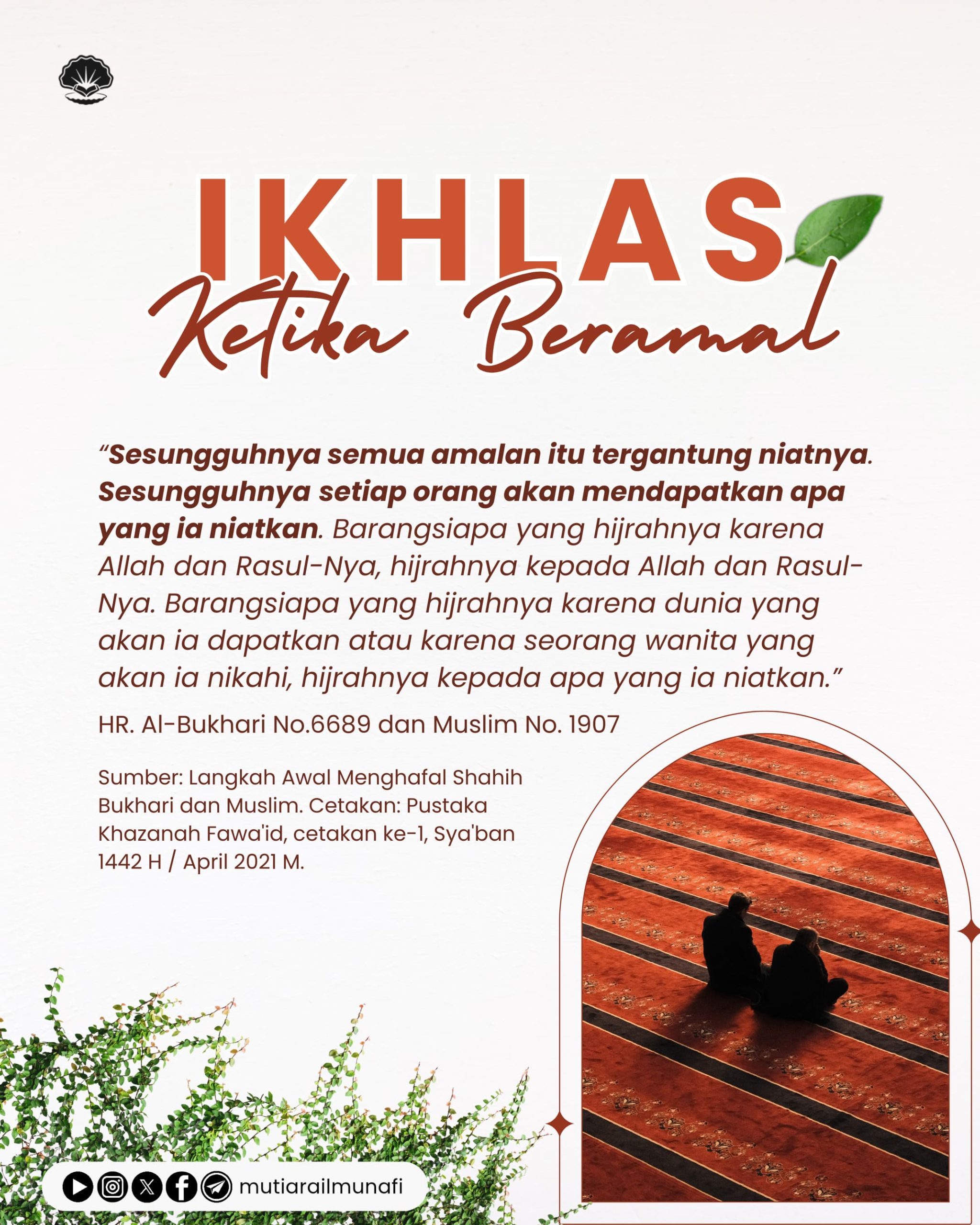 🌱 𝗜𝗞𝗛𝗟𝗔𝗦 عَنْ عُمَرَ بْنِ الْخَطَّابِ قَالَ: سَمِعْتُ رَسُولَ اللهِ -صَلَّى اللهُ عَلَيْهِ وَسَلَّمَ- يَقُولُ: (( إِنَّمَا الْأَعْمَالُ بِالنِّيَّاتِ، وَإِنَّمَا…