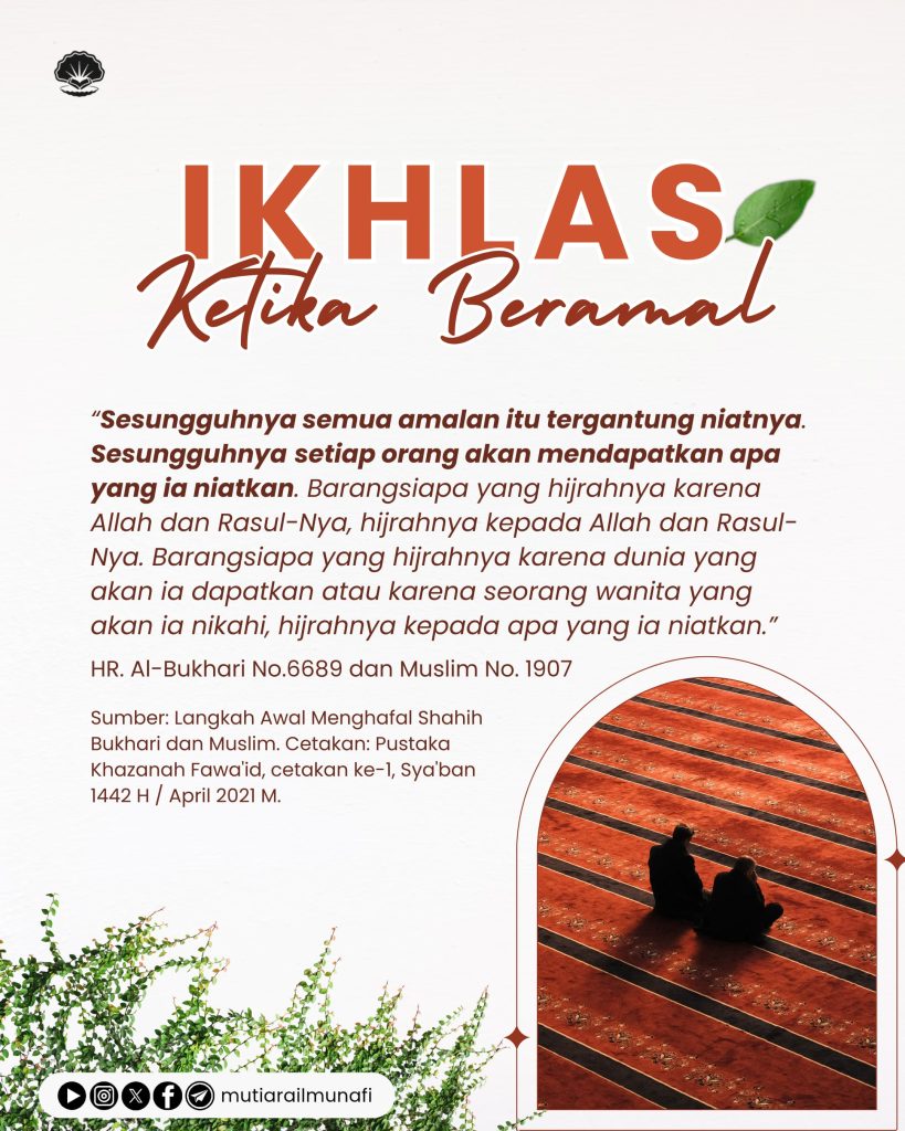 โSesungguhnya semua amalan itu tergantung niatnya. Sesungguhnya setiap orang akan mendapatkan apa yang ia niatkan. Barangsiapa yang hijrahnya karena Allah dan Rasul-Nya, hijrahnya kepada Allah dan Rasul-Nya. Barangsiapa yang hijrahnya karena dunia yang akan ia dapatkan atau karena seorang wanita yang akan ia nikahi, hijrahnya kepada apa yang ia niatkan.โ