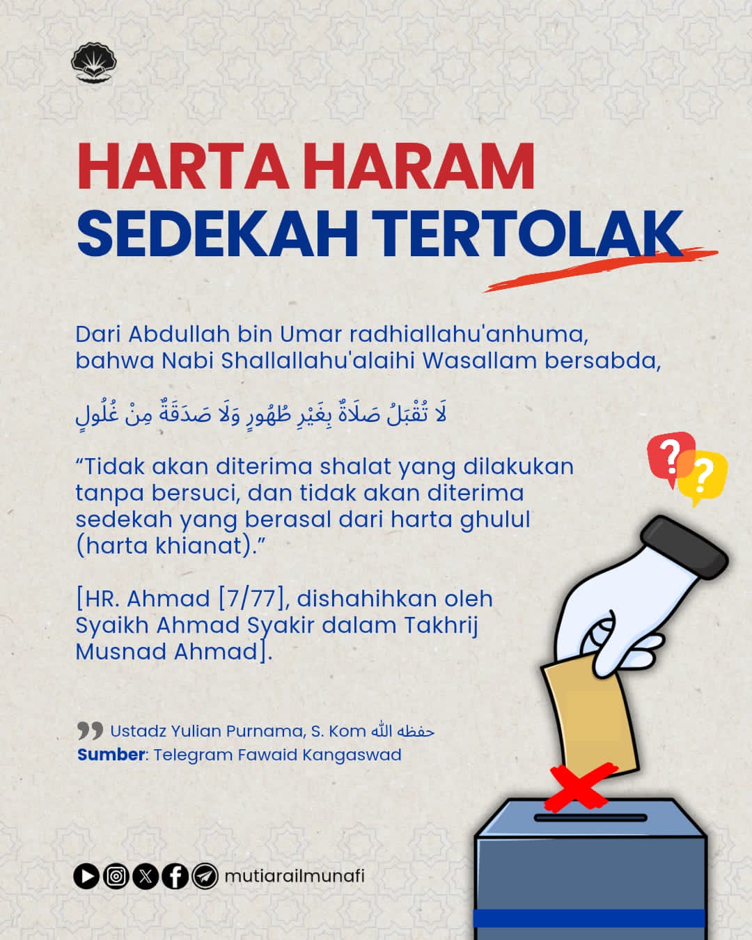 💵 𝗦𝗘𝗗𝗘𝗞𝗔𝗛 𝗗𝗔𝗥𝗜 𝗛𝗔𝗥𝗧𝗔 𝗛𝗔𝗦𝗜𝗟 𝗞𝗢𝗥𝗨𝗣𝗦𝗜 𝗧𝗜𝗗𝗔𝗞 𝗔𝗞𝗔𝗡 𝗗𝗜𝗧𝗘𝗥𝗜𝗠𝗔 Dari Abdullah bin Umar radhiallahu’anhuma, bahwa Nabi Shallallahu’alaihi Wasallam bersabda, لَا…