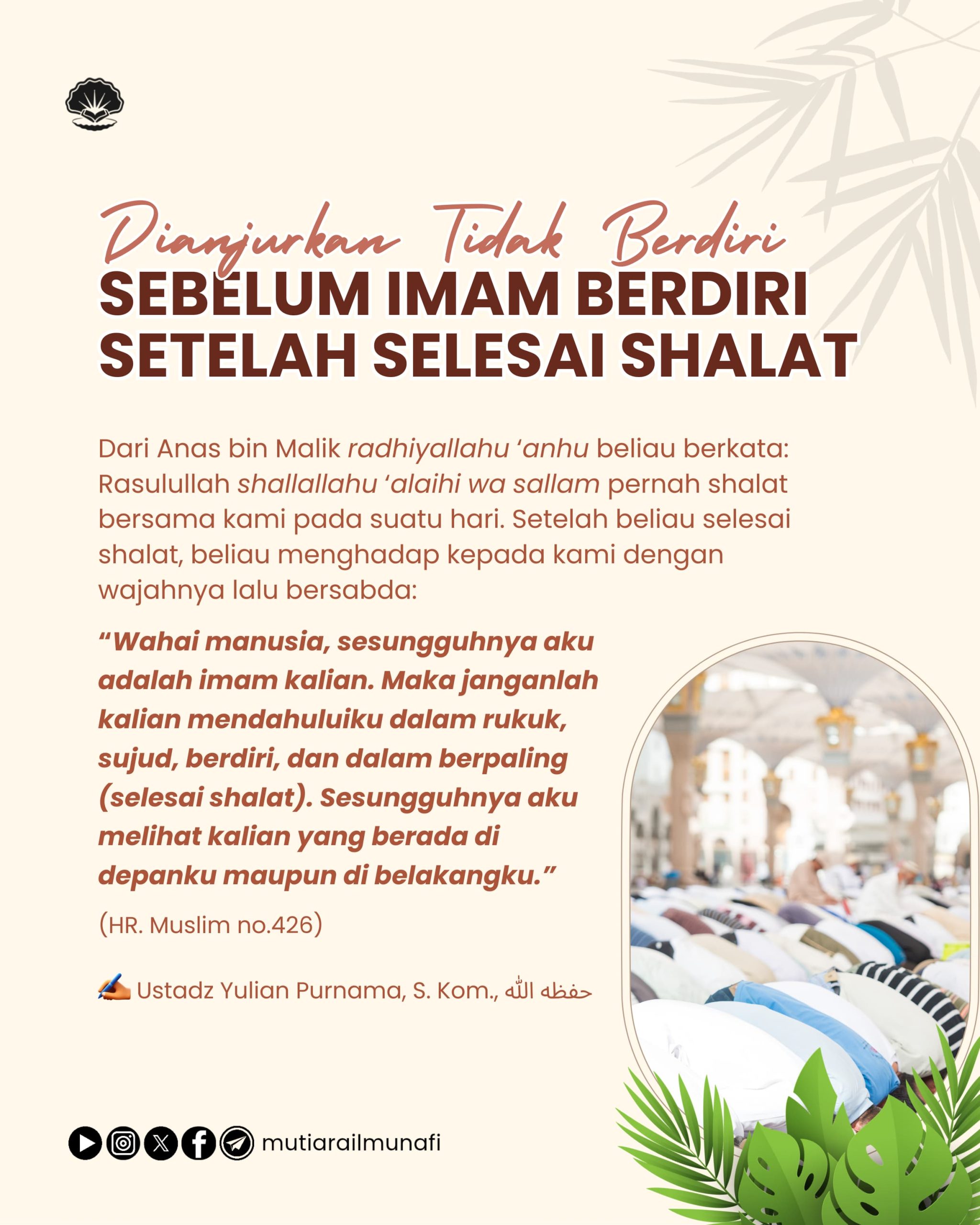 ⚠️𝗗𝗜𝗔𝗡𝗝𝗨𝗥𝗞𝗔𝗡 𝗧𝗜𝗗𝗔𝗞 𝗕𝗘𝗥𝗗𝗜𝗥𝗜 𝗦𝗘𝗕𝗘𝗟𝗨𝗠 𝗜𝗠𝗔𝗠 𝗕𝗘𝗥𝗗𝗜𝗥𝗜 𝗦𝗘𝗧𝗘𝗟𝗔𝗛 𝗦𝗘𝗟𝗘𝗦𝗔𝗜 𝗦𝗛𝗔𝗟𝗔𝗧 Dari Anas bin Malik radhiyallahu ‘anhu beliau berkata: صَلَّى بِنَا رَسُولُ…
